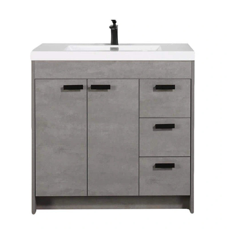 Eviva Lugano 36-inch Cement Gray Vanity Elevate your bathroom with the Eviva Lugano Cement Gray Vanity. Designed with high-grade engineered wood and a sleek acrylic top, it combines modern style with functional storage. Its soft-closing drawers and doors a
