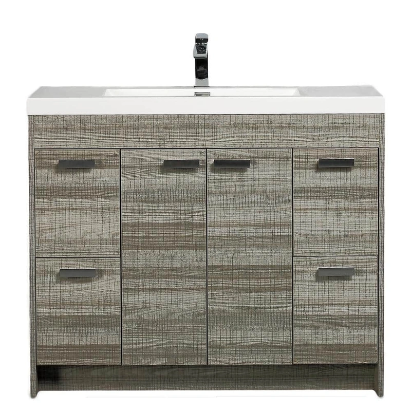 Lugano 42" Ash Single Bath Vanity The Eviva Lugano 42" Bath Vanity in Ash pairs sleek contemporary design with practical functionality, making it a standout choice for modern bathroom renovations. Featuring a seamless white acrylic top with an integrated s