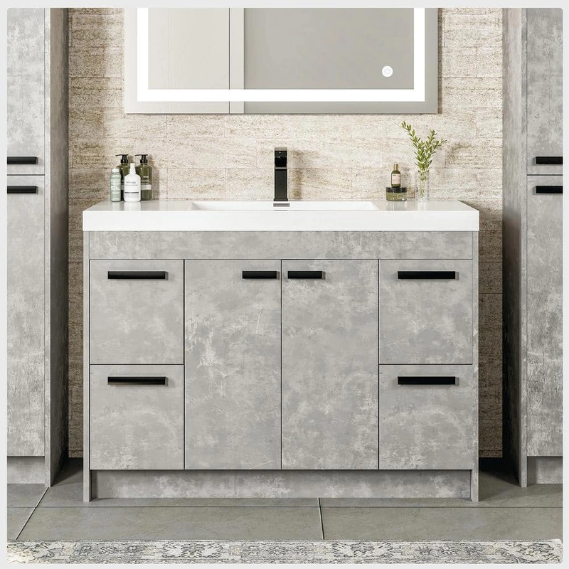 Eviva Lugano 42" Single Bath Vanity Upgrade your bathroom decor with the Eviva Lugano 42" Cement Gray Vanity. Featuring a modern, textured finish and an integrated acrylic sink, this vanity combines style with functionality. With a spacious design, it offe