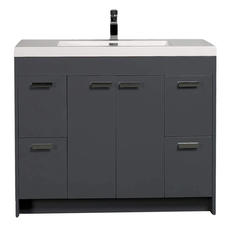 Upgrade your bathroom with the Eviva Lugano 42″ Gray Single Bath Vanity, featuring a sleek acrylic top and integrated sink. Crafted with high-grade engineered wood and designed for modern aesthetics, this vanity offers substantial storage with soft-closing drawers and doors, making it an ideal blend of style and functionality.