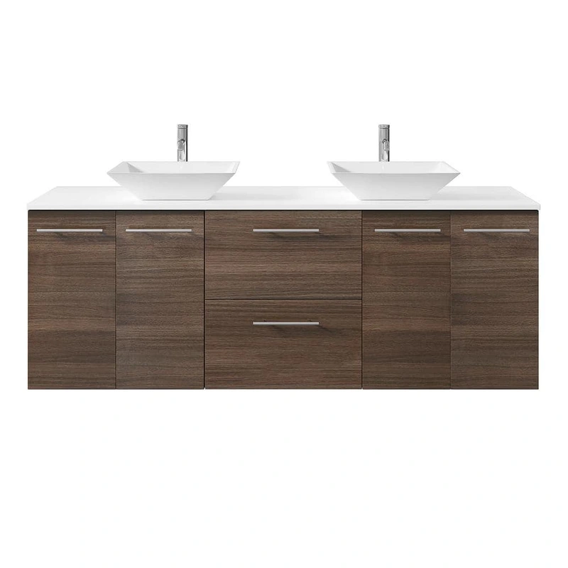 Eviva Lux Floating Bath Vanity The Eviva Lux 60-inch floating bath vanity combines sleek modern design with functional storage, offering a Gray Oak finish enhanced by a pristine white tempered glass top. Perfect for enhancing your bathroom's aesthetics, th