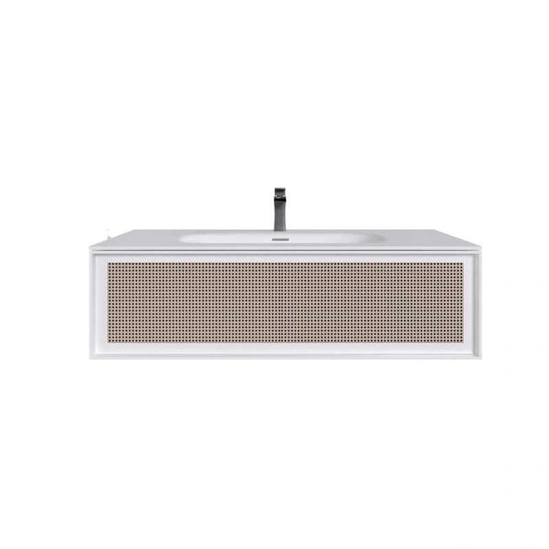 Discover how the Eviva Nets Vanity can transform your powder room into a sanctuary of sophistication. Its sleek lines and natural oak finish create a seamless flow, while its integrated solid surface sink adds a touch of minimalistic grandeur. The standout rattan drawer face brings a hint of organic texture, making it a perfect complement to crisp tile or warm wooden floors. Undoubtedly, this piece will elevate everyday routines to an artful experience, essential for opulent living.
