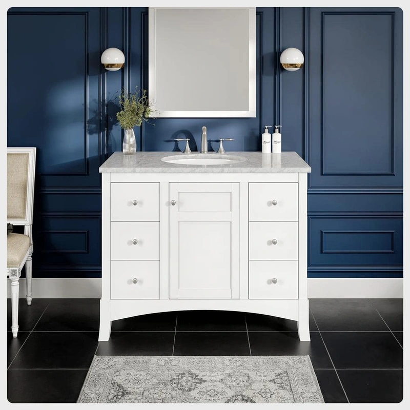 Eviva 42" White Vanity with Carrara Top The Eviva New York 42-inch Bathroom Vanity exudes classic elegance with its solid wood construction, topped by a luxurious White Carrara marble surface. This fully assembled piece features an undermount porcelain sin