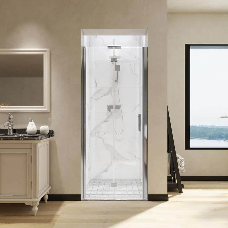 Transform your bathroom into a modern sanctuary with the FORCLOVER Frameless Bi-Fold Shower Door. This piece’s sleek chrome accents and clear tempered glass create an aura of sophistication, perfect for any contemporary space. Its unique folding mechanism is a marvel in space conservation, making it a delightful solution for corner installations. This is not merely a door; it is a statement of sleek design and luxurious utility that your bathroom can’t afford to miss.