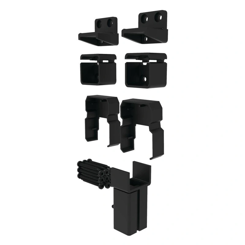 A: The package includes a set of 2 top and 2 bottom brackets, along with screws for mounting the rail panel to the post.