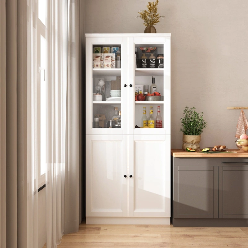 Modern White Curio Cabinet with Glass Doors Elevate your space with the FUFU&GAGA Contemporary/Modern White Curio Cabinet, boasting a sleek design and robust construction. Featuring 4 doors, including 2 elegant glass ones, and 5 customizable shelves, t