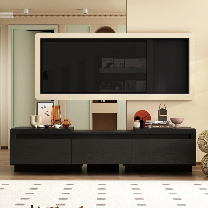 Modern Black TV Cabinet with Adjustable Length Elevate your living space with the FUFU&GAGA Modern Black TV Cabinet, designed to accommodate TVs over 70 inches. This sleek piece boasts extendable length options and offers ample storage with three drawe