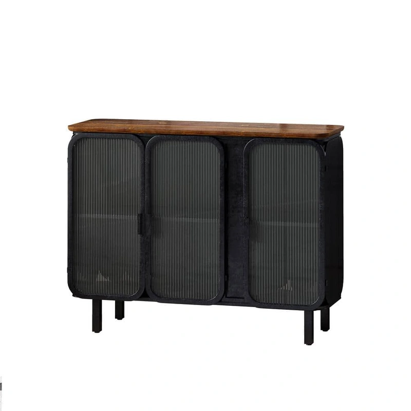 Upgrade your kitchen space with the FUNKOL Black Metal Kitchen Cabinet, featuring a sleek design and fluted glass doors. Crafted from durable iron, tempered glass, and cedar wood, this ready-to-assemble cabinet offers both style and functionality with its spacious storage compartments.