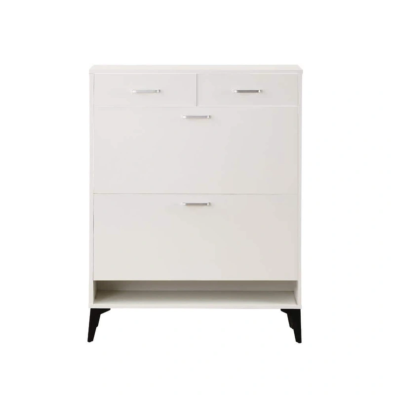 Freestanding Flip-Flop Shoe Cabinet with Drawers Optimize your space with the FUNKOL Freestanding Flip-Flop Shoe Cabinet, an elegant storage solution for shoes and accessories. Crafted from high-quality MDF, this sleek white cabinet features two flip-flop