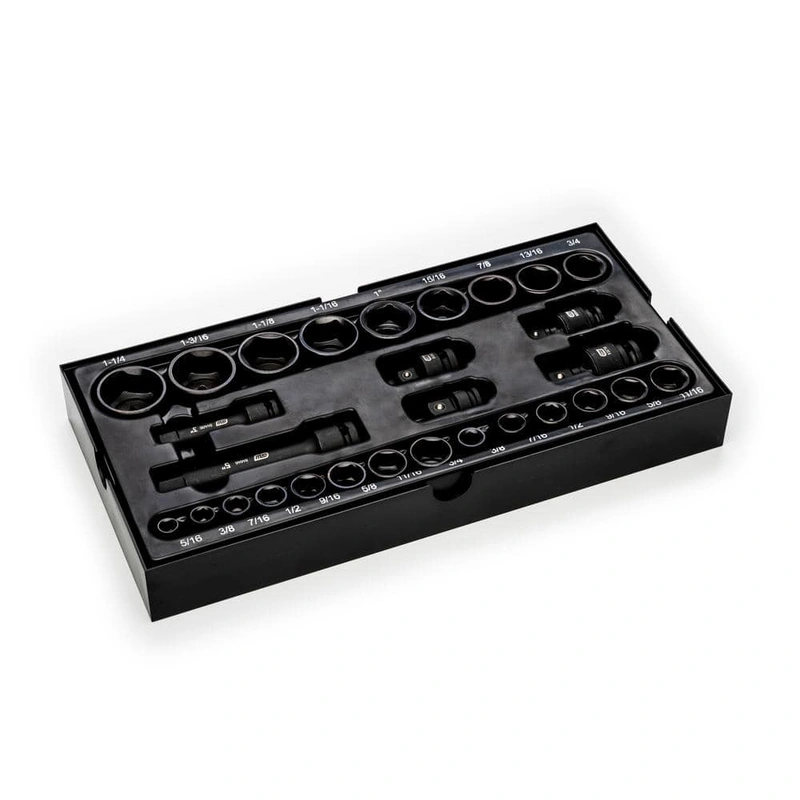 29-Piece SAE Impact Socket Tray Set The GEARWRENCH 29-Piece SAE Impact Socket Tray Set is engineered for high-performance tasks, crafted from chrome molybdenum alloy steel for superior strength and durability. Its black oxide finish ensures resistance agai
