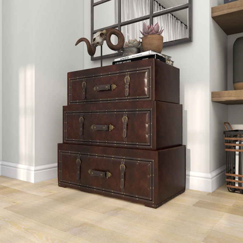 Vintage Faux Leather 3-Drawer Accent Chest The Grayson Lane Vintage Faux Leather 3-Drawer Accent Chest offers timeless elegance with a traditional design. Skillfully crafted from solid wood and adorned with faux leather, this chest combines style and funct