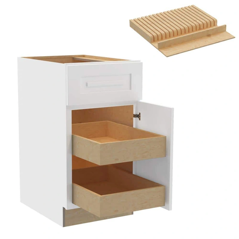 With its refreshing Pacific White hue, the Grayson Base Kitchen Cabinet from Home Decorators Collection embodies modern elegance and timeless charm. Its standout feature, the soft-close mechanism on both doors and drawers, whispers luxury with every touch, while the built-in knife block offers practical sophistication. Imagine adorning this pristine cabinet with brass hardware, evoking a curated chef’s paradise. Essential for the heart of your home, the Grayson cabinet is a foundational piece in any bespoke kitchen dream.