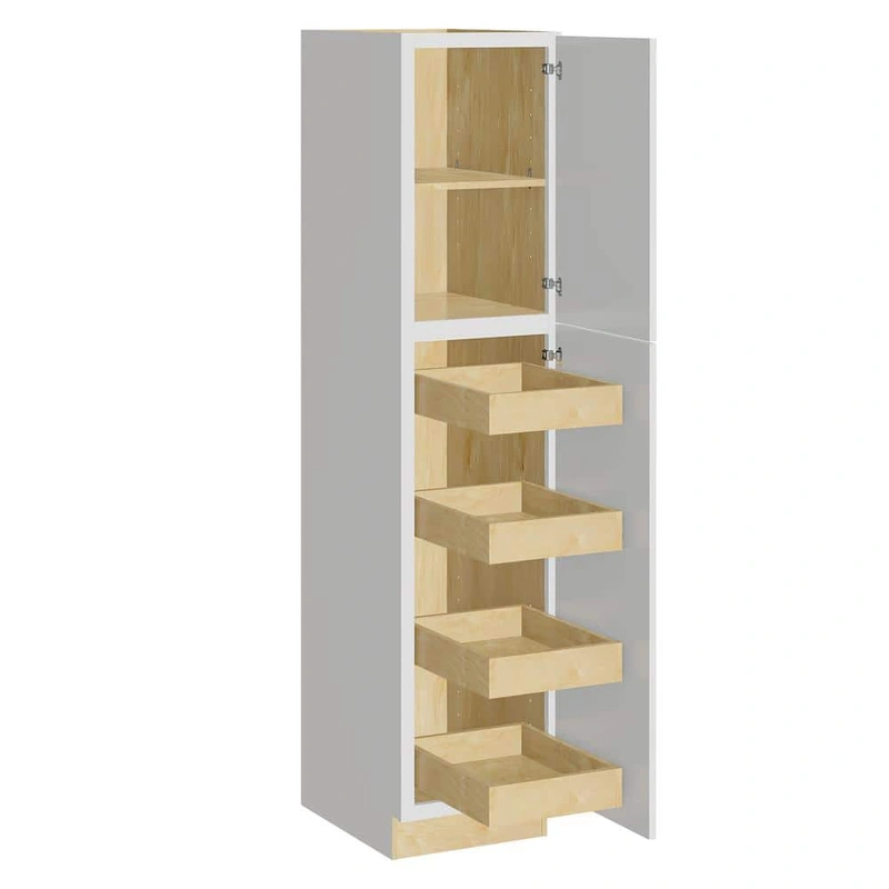 Transform your kitchen with the Grayson plywood pantry cabinet from Home Decorators Collection. Finished in a sleek Pacific White, this assembled cabinet combines aesthetic elegance with practical functionality, featuring soft-close doors and multiple rollout trays for effortless organization. Designed with durability in mind, the cabinet’s all-wood construction guarantees lasting quality and a polished look that complements any transitional kitchen style.