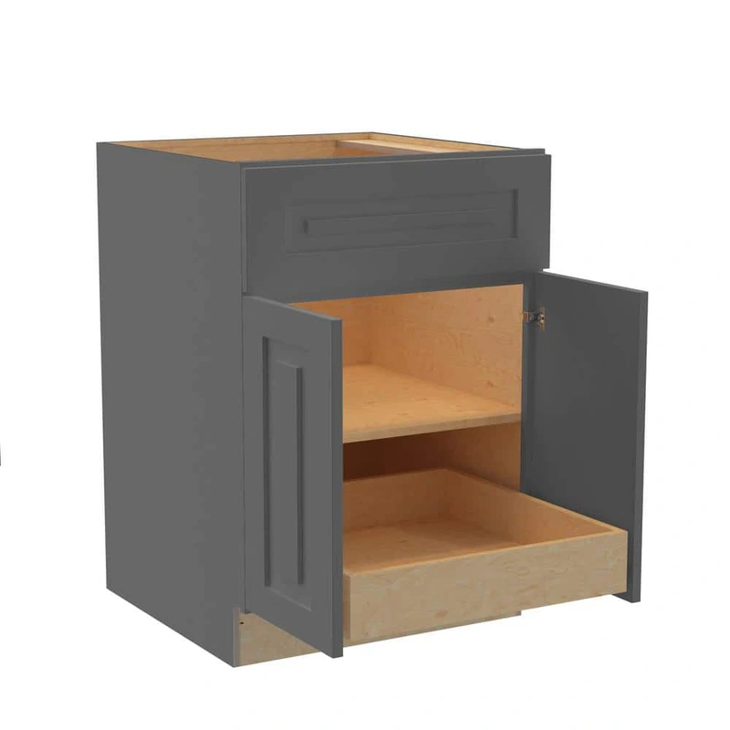 Upgrade your kitchen with the Home Decorators Collection Grayson 24 in. W Base Cabinet. Featuring a sophisticated Deep Onyx finish, this cabinet combines the elegance of Shaker-style doors with the durability of plywood construction. With soft-close technology and full-depth shelves, its the perfect fusion of style and function.