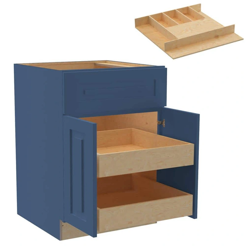 The Home Decorators Collection Grayson Plywood Base Kitchen Cabinet in Mythic Blue combines elegance and functionality with its transitional shaker style and superior craftsmanship. Featuring soft-close doors and drawers, as well as robust construction with all-plywood CARB compliance, this cabinet is designed for durability and ease of use, making it a sophisticated addition to any kitchen.