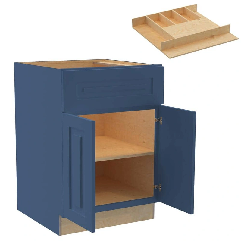 Grayson Mythic Blue Plywood Base Kitchen Cabinet Enhance your kitchen's elegance with the Home Decorators Collection's Grayson Base Kitchen Cabinet, featuring a stunning Mythic Blue finish. This 24-inch wide cabinet offers contemporary shaker styling and a
