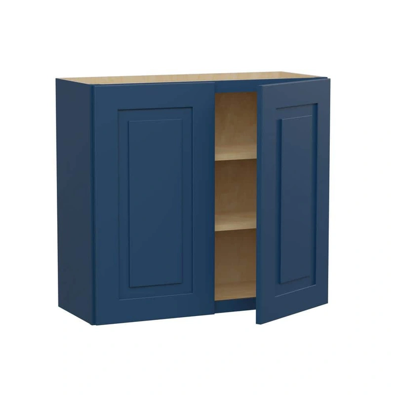 Enhance your kitchen with the sophisticated Grayson Mythic Blue Wall Kitchen Cabinet from Home Decorators Collection. This cabinet boasts a transitional Shaker door style with a rich dark blue finish, crafted from sturdy all-plywood construction. Enjoy the convenience of soft-close doors and the durability required for lasting elegance in your home.