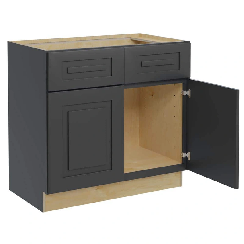 Grayson Plywood Sink Base Cabinet in Deep Onyx The Grayson Plywood Sink Base Cabinet in Deep Onyx by Home Decorators Collection is the epitome of style and durability for any bathroom renovation. Featuring a chic Transitional Shaker style with a deep onyx