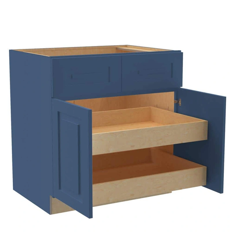 The Grayson Mythic Blue Base Kitchen Cabinet by Home Decorators Collection offers sophisticated elegance with its Transitional Shaker style and rich dark blue finish. The cabinet features soft-close doors and drawers, as well as two rollout trays for convenient organization. Crafted from an all-plywood construction, this unit is built to last while adding timeless style to your kitchen.