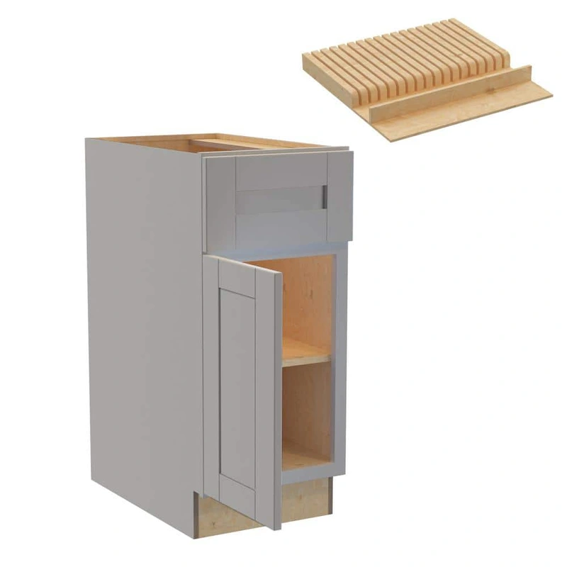 Gray Shaker Base Kitchen Cabinet with Knife Block The Home Decorators Collection's Veiled Gray Shaker Base Kitchen Cabinet offers an elegant blend of style and functionality with its robust plywood construction and soft-close features. With its timeless sh