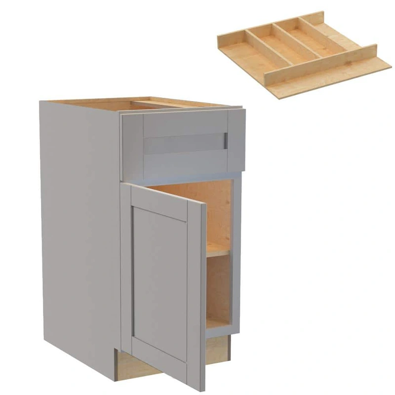 Veiled Gray Shaker Base Kitchen Cabinet with Utility Tray Enhance your kitchen's functionality and style with the Home Decorators Collection's Veiled Gray Shaker Base Kitchen Cabinet. This durable plywood cabinet features a sophisticated Shaker design, sof