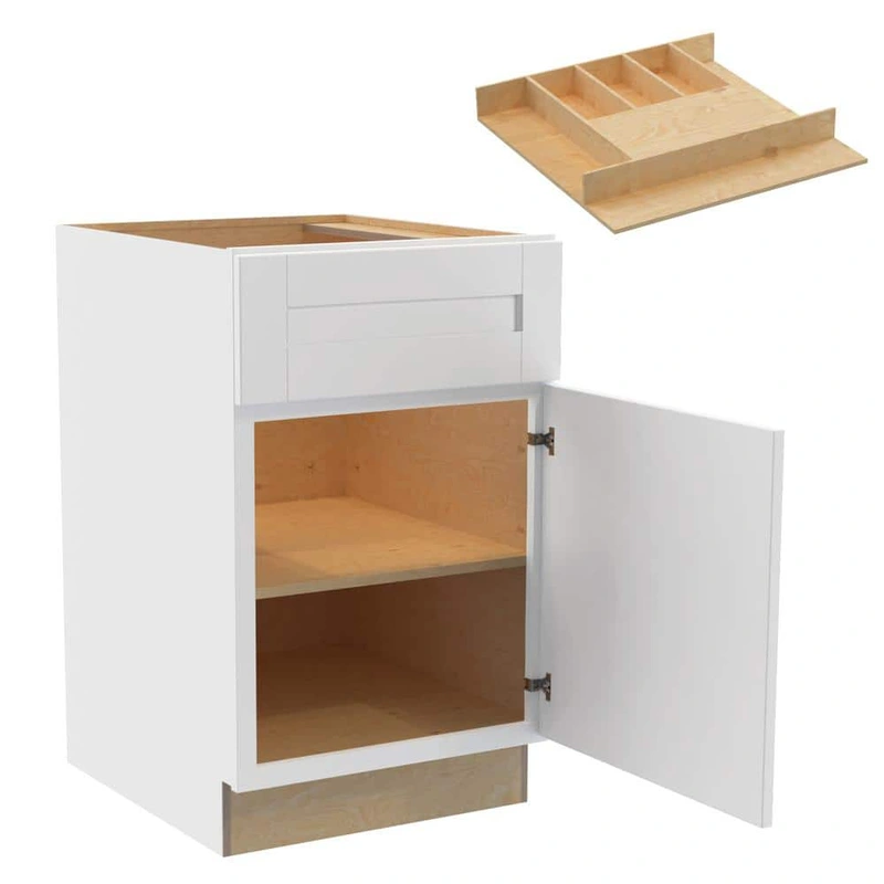 Enhance your kitchen’s elegance with the Vesper White Shaker-style base cabinet from Home Decorators Collection. Crafted with premium CARB II compliant plywood, this cabinet offers soft close functionality and a sophisticated, durable design. Includes a cutlery tray for ultimate organization, making it a practical addition to any modern kitchen.