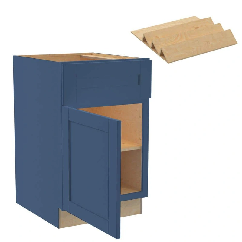 Vessel Blue Shaker Base Kitchen Cabinet with Spice Tray Enhance your kitchen with the Home Decorators Collection Vessel Blue Shaker Base Cabinet. Crafted from durable plywood and MDF, this cabinet combines robust construction with sleek shaker style. Featu
