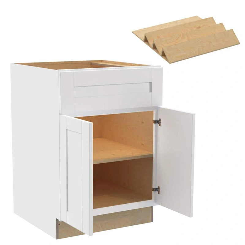 Vesper White Shaker Base Kitchen Cabinet with Spice Tray Enhance your kitchen with the Washington Vesper White Shaker Base Kitchen Cabinet. Crafted from durable plywood and MDF, this cabinet combines stylish design with functionality, featuring a sleek vin