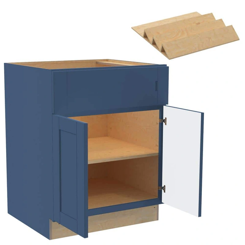 The Washington Vessel Blue Shaker Base Kitchen Cabinet from Home Decorators Collection offers a chic, modern touch to any kitchen space. Crafted with CARB II compliant plywood and a durable vinyl finish, this cabinet combines style and functionality with soft-close doors and drawers, as well as a convenient spice tray insert.