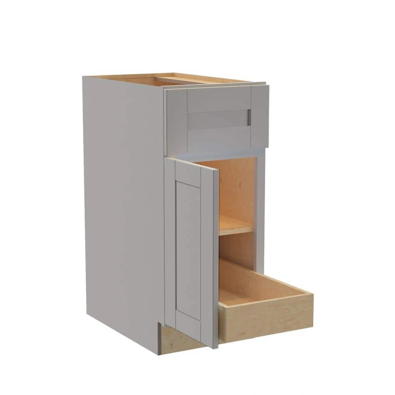 This Veiled Gray Shaker Assembled Base Kitchen Cabinet by Home Decorators Collection offers an elegant, modern touch to any kitchen. Crafted with durable, CARB II compliant plywood, it features sleek, soft-close doors and a vinyl finish for easy cleaning and resilience. This cabinetry provides functional elegance and generous storage, elevating your kitchen space effortlessly.