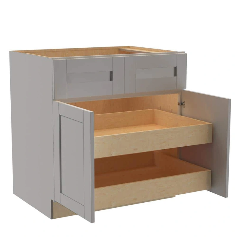 The Washington Veiled Gray Shaker Base Cabinet by Home Decorators Collection offers a blend of style and practicality for the modern kitchen. Crafted from durable CARB II compliant plywood with elegant veiled gray thermofoil finish, this cabinet features soft-close doors and drawers, ensuring quiet convenience. Its clean shaker design adds timeless sophistication while the robust construction guarantees long-lasting utility.