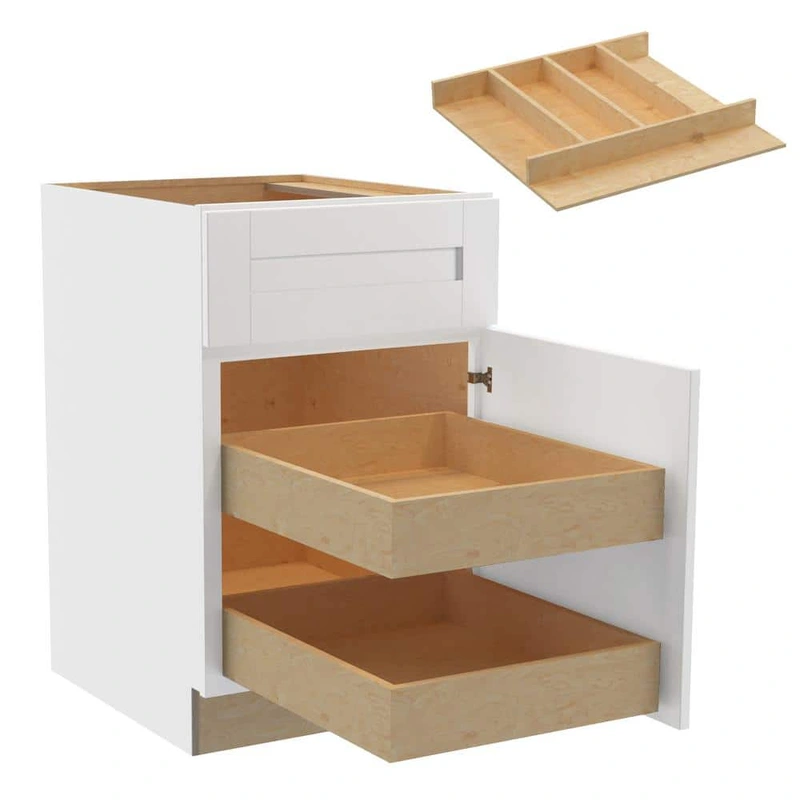 Elevate your kitchen space with the Vesper White Shaker Base Kitchen Cabinet by Home Decorators Collection. Crafted from durable plywood with a sleek, vinyl-clad finish, this cabinet offers both timeless style and reliable storage. Its soft-close drawers and rollout trays make organizing your kitchen effortless.