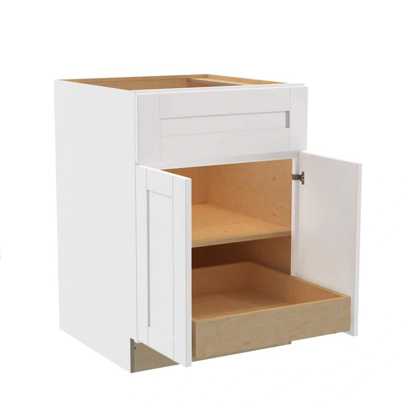 Vesper White Shaker Base Kitchen Cabinet Discover the timeless elegance and exceptional storage of the Washington Vesper White Shaker Kitchen Cabinet by Home Decorators Collection. This pre-assembled base cabinet boasts a soft close feature, framed MDF sha