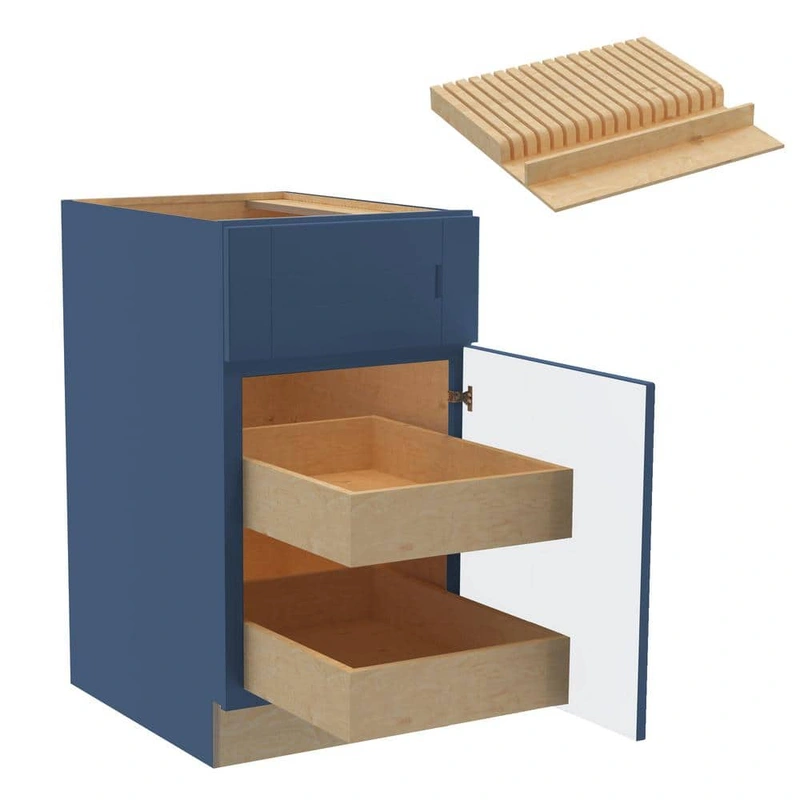 The Washington Vessel Blue Shaker Base Cabinet by Home Decorators Collection combines timeless elegance with modern functionality. Its rich blue finish adds a designer touch to any kitchen, while the soft-close roll-out trays and sturdy plywood construction ensure convenience and durability.