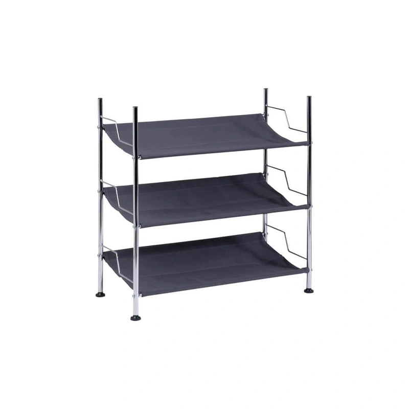 Effortlessly organize your entryway or closet with the Honey-Can-Do 3-Tier Black Steel Shoe Rack. Capable of holding up to nine pairs of shoes, this stylish rack combines sleek design with durable construction, featuring cotton canvas shelves supported by a chrome-plated steel frame. Its contemporary style fits any decor while keeping shoes neatly stored and easily accessible.