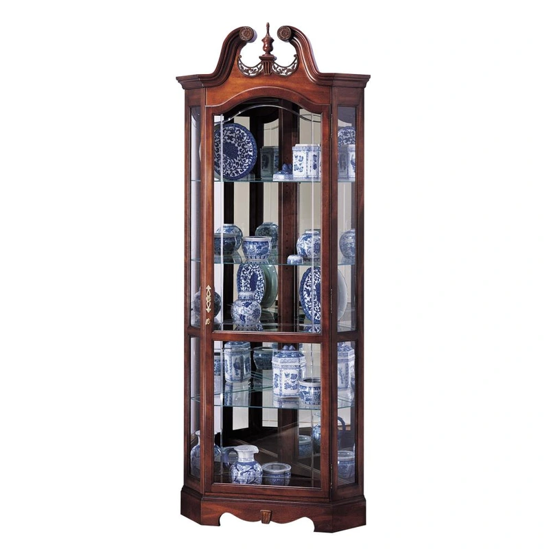 Windsor Cherry Curio Cabinet Showcase your treasures with the Howard Miller Windsor Cherry Curio Cabinet, featuring a striking swan neck pediment with intricate overlays for a touch of elegance. Crafted in Windsor cherry on select hardwoods and veneers, th