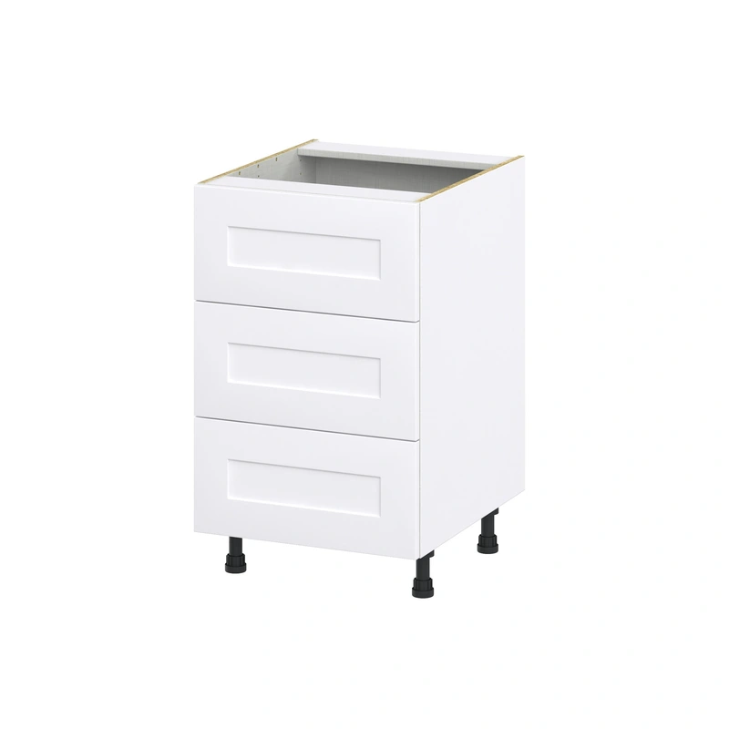 Hugo&Borg 3-Drawer Recessed Panel Base Cabinet The Hugo&Borg 3-Drawer Base Cabinet offers unmatched style and functionality with its European frameless design, providing up to 20% more storage space. Finished in a warm white, this fully assembled,
