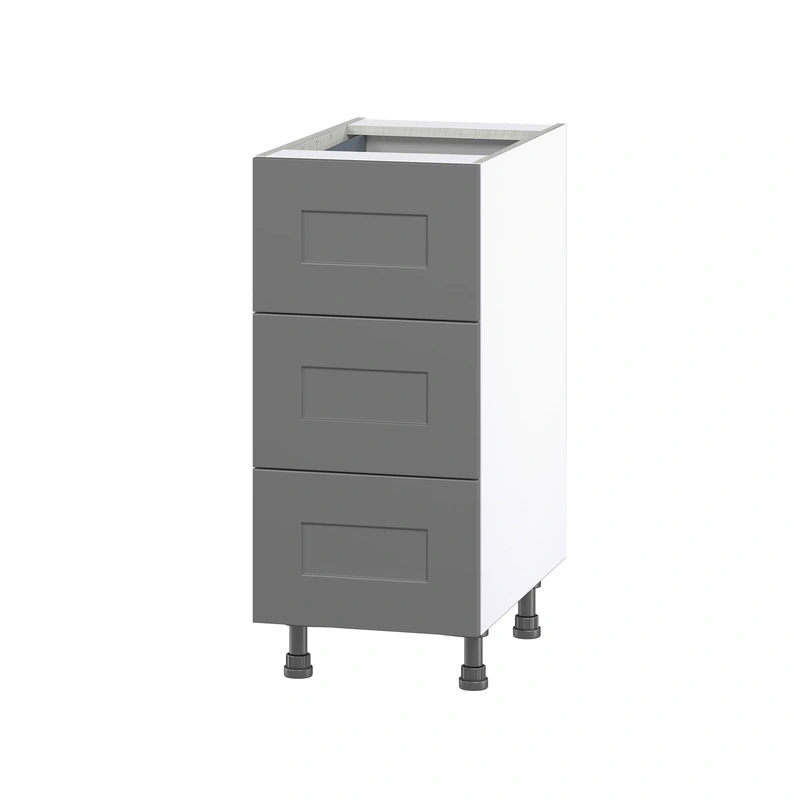 Slate Gray 3-Drawer Base Cabinet The Hugo&Borg Beaumont 3-Drawer Base Cabinet in Slate Gray offers a perfect blend of sophistication and functionality, ideal for professional and home improvement projects. With its fully assembled design, this cabinet