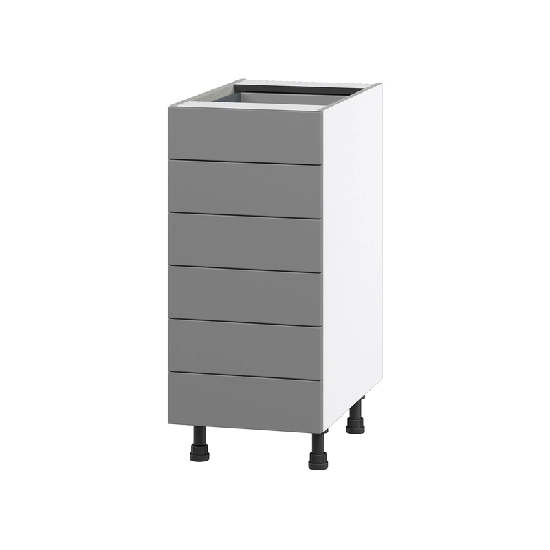 Beaumont Slate Gray 6-Drawer Base Cabinet The Beaumont Slate Gray Base Cabinet by Hugo&Borg features a sleek, modern design with six spacious drawers for optimized storage. Its fully assembled construction and durable MDF build ensure it withstands dai