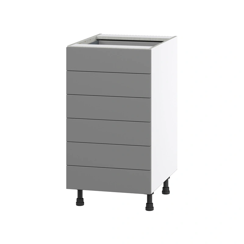 Slate Gray 6-Drawer Base Cabinet Elevate your kitchen or bathroom space with the Hugo&Borg Beaumont 6-Drawer Base Cabinet. This fully assembled unit comes in a sophisticated slate gray finish with robust, full-extension soft-close metal drawers for enh
