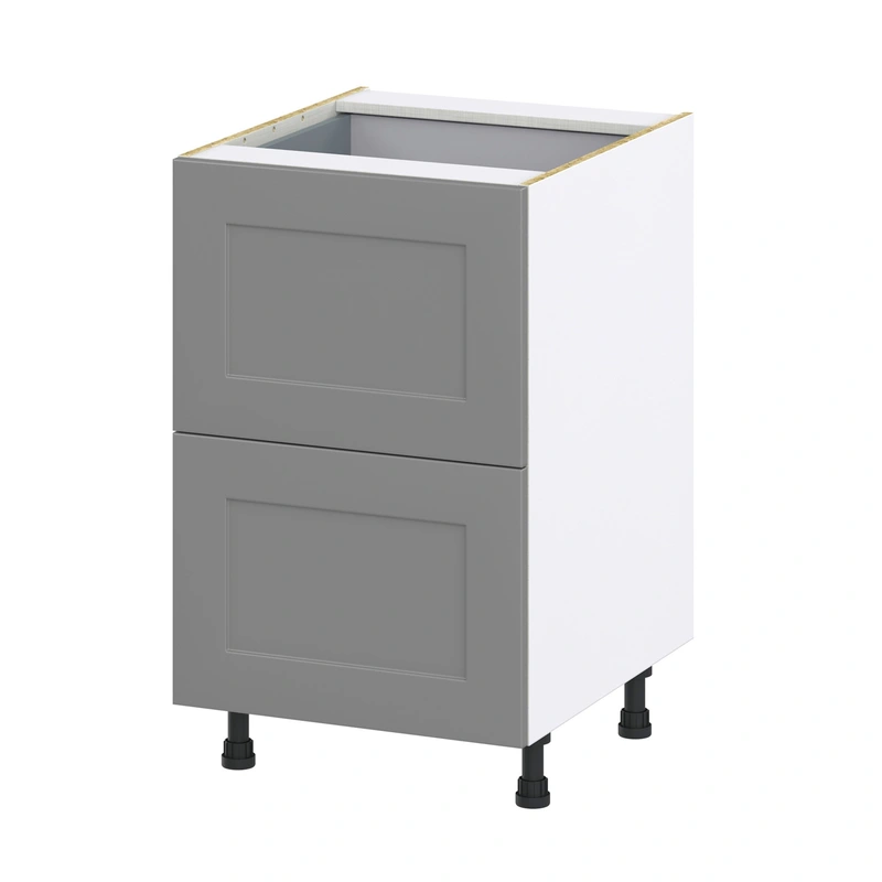 Slate Gray 3-Drawer Base Cabinet The Hugo&Borg Beaumont slate gray cabinet offers a seamless blend of style and functionality. It features a modern, recessed panel design with a durable hand-painted finish for a designer look. Fully assembled and ready