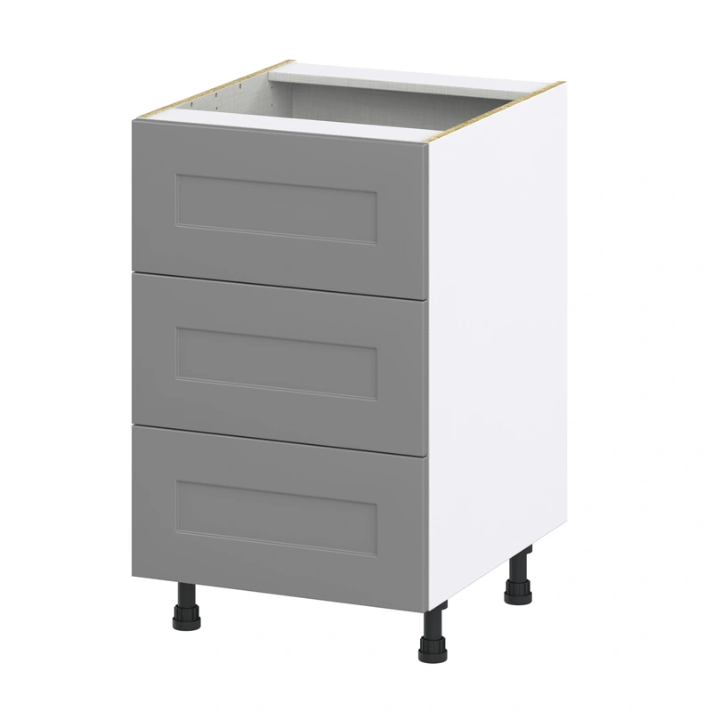 Slate Gray 3-Drawer Base Cabinet with Recessed Panels The Hugo&Borg Beaumont 3-Drawer Base Cabinet combines modern design with unmatched durability. Constructed with European-style frameless design, it offers 2% more storage capacity, fully assembled i