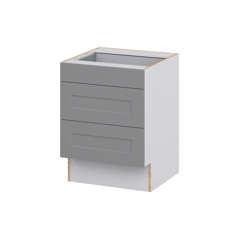 Hugo&Borg Beaumont 3-Drawer Base Cabinet, Slate Gray The Hugo&Borg Beaumont 3-Drawer Base Cabinet in Slate Gray combines modern aesthetic with practical functionality, making it a stellar choice for any kitchen or bathroom. Its European frameless d