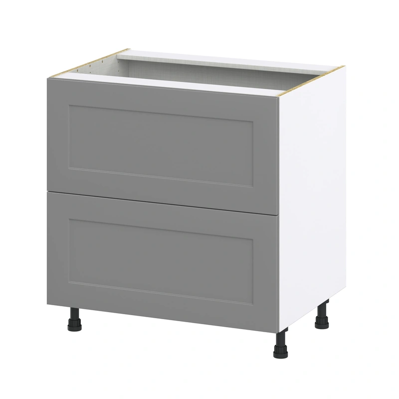 Slate Gray 2-Drawer Base Cabinet The Hugo&Borg Beaumont Base Cabinet is a designer's dream, offering a modern slate gray finish and fully assembled convenience. It features a spacious two-drawer design with a European-style frameless construction for m