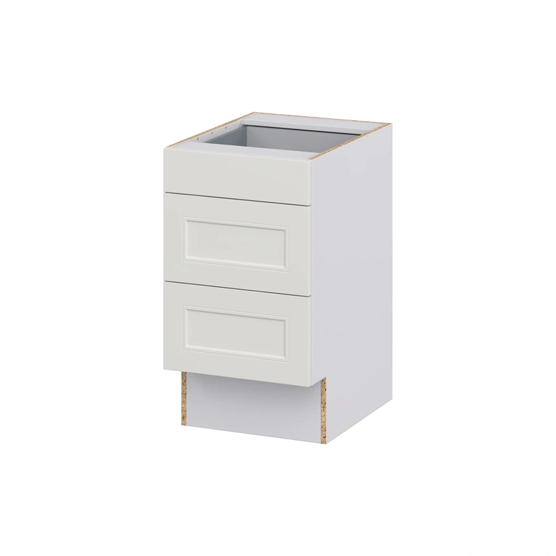 The Hugo&Borg Belcourt Gray 3-Drawer Base Cabinet transforms any kitchen or bathroom into a sophisticated sanctuary. Its striking recessed panel design adds depth and dimension, while the painted light gray finish perfectly complements a range of color schemes, from crisp whites to rich, dark hues. Style it with elegant brass hardware to accentuate its graceful appearance. An essential piece for those who desire luxury with practicality, this cabinet effortlessly combines form and function.