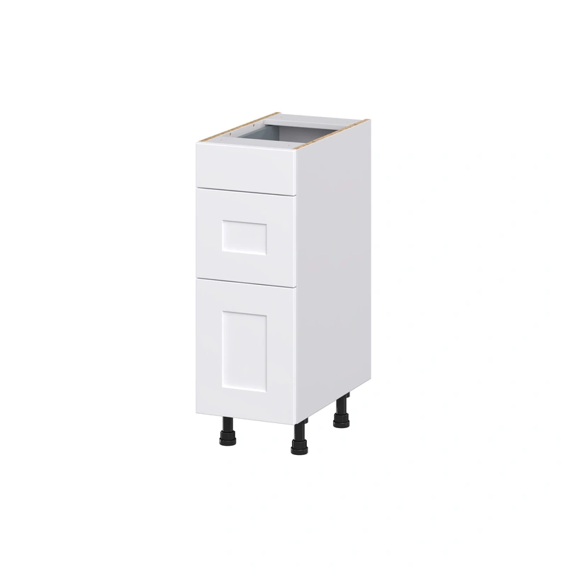 Hugo&Borg Jolie 3-Drawer Base Cabinet The Hugo&Borg Jolie 3-Drawer Base Cabinet in Warm White is the perfect marriage of style and functionality. This fully assembled, recessed panel cabinet offers exceptional storage with its European frameless de
