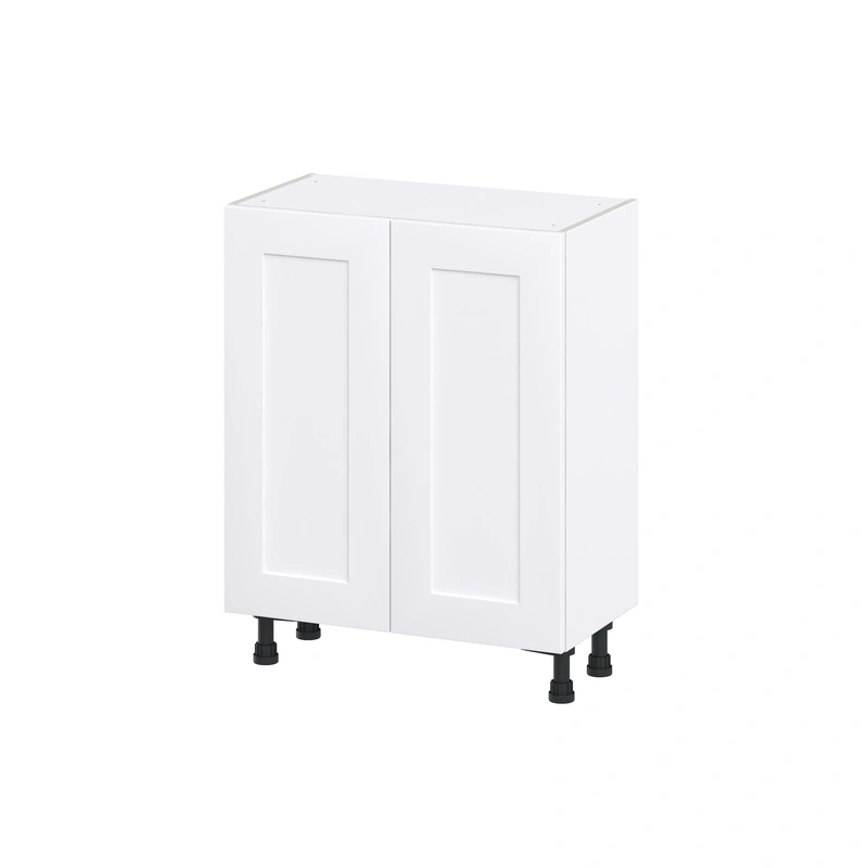 The Hugo&Borg Jolie Base Cabinet offers a modern touch with its recessed panel shaker door style in a warm white finish. This pre-assembled cabinet provides increased storage space with premium soft-close doors and a fully-adjustable shelf. Crafted for durability, its European-style frameless construction is designed to enhance any professional or DIY remodeling project.