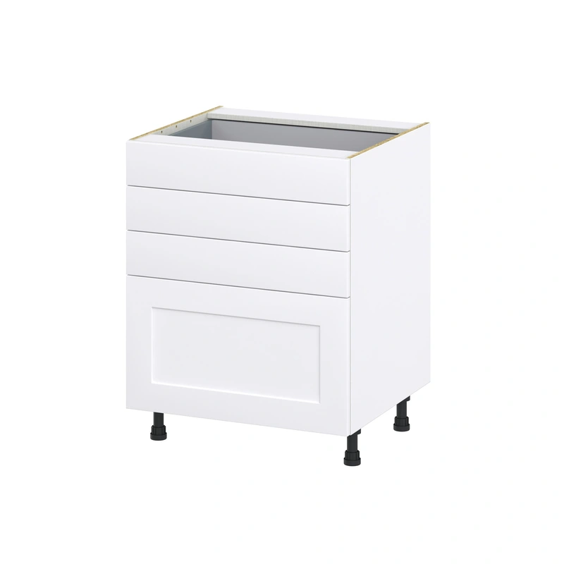 Jolie 27" Warm White 4-Drawer Cabinet The Jolie 27" Warm White 4-Drawer Cabinet by Hugo&Borg seamlessly combines style and functionality. Its fully assembled, European-style frameless construction offers 20% more storage, while the recessed panel desig