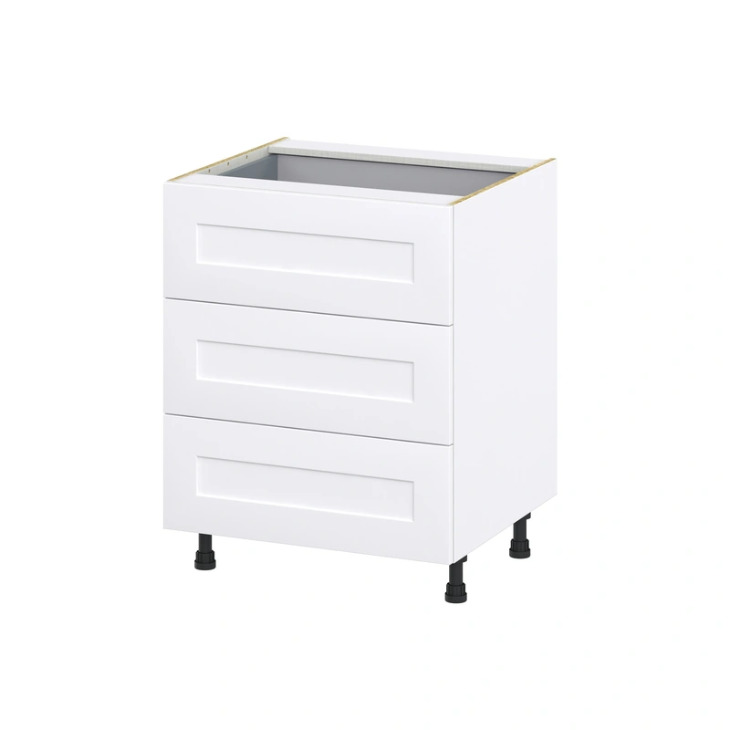 The Jolie Warm White 4-Drawer Base Cabinet combines elegance and functionality in a fully assembled, recessed panel style. With its frameless design offering up to 20% more storage and sophisticated soft-close features, this cabinet is the ideal solution for modern, efficient kitchen spaces.