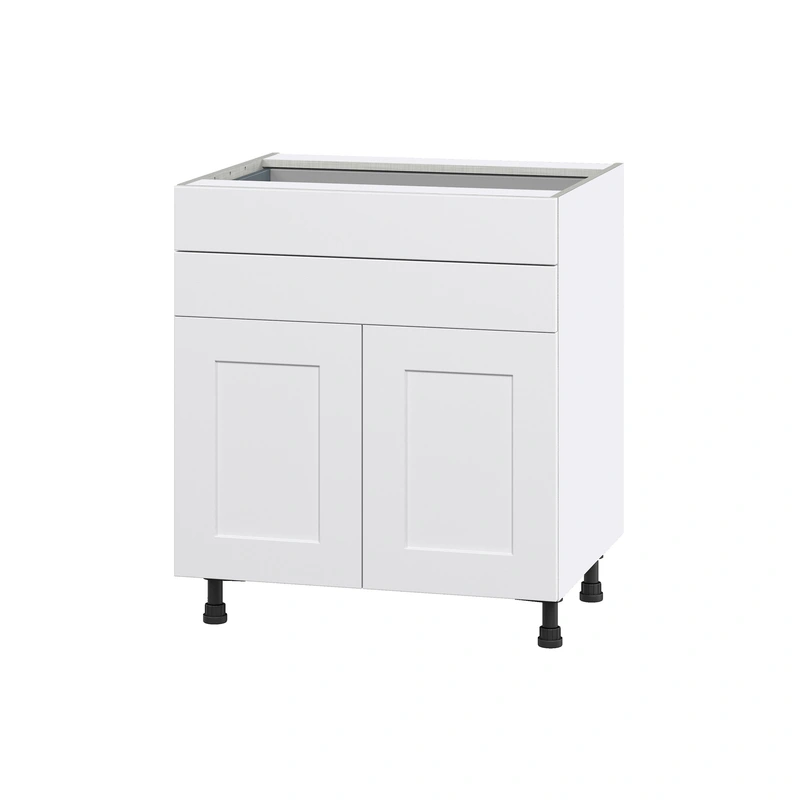 The Jolie Shaker-Style 2-Drawer Base Cabinet in Warm White by Hugo&Borg combines elegance and functionality, ideal for both traditional and modern kitchens. Its fully assembled design with full access box construction provides 20% more storage, while soft-close features ensure quiet and smooth operation.